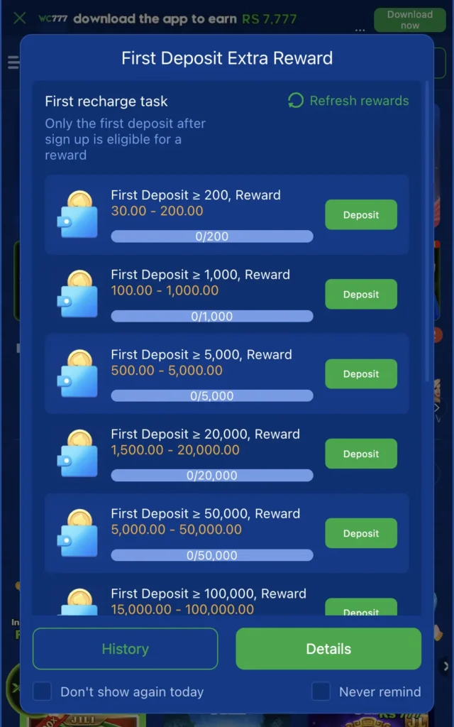 WC777 show level system. Users increase level by doing tasks, playing small games, and staying active. Every level show progress bar. The app give small perks. This motivate users. Pakistan users like this because it show improvement in clear line.